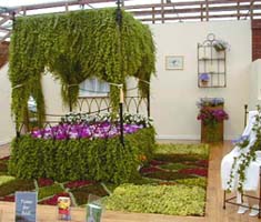 The computer is at Kinder Gardens Sunflower Street, "Time for Bed" display in the Floral Marquee West, where a floral bedroom had been created. T'his consists of a wrought iron four poster bed clothed in a quilt of 'Accent Mystic Mixture' busy lizzie. The canopy of the bed was created from hanging mint, Satureja douglasii, which filled the air with its pungent aroma.