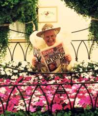 The computer is at Kinder Gardens Sunflower Street, "Time for Bed" display in the Floral Marquee West, where a floral bedroom had been created. T'his consists of a wrought iron four poster bed clothed in a quilt of 'Accent Mystic Mixture' busy lizzie. The canopy of the bed was created from hanging mint, Satureja douglasii, which filled the air with its pungent aroma.